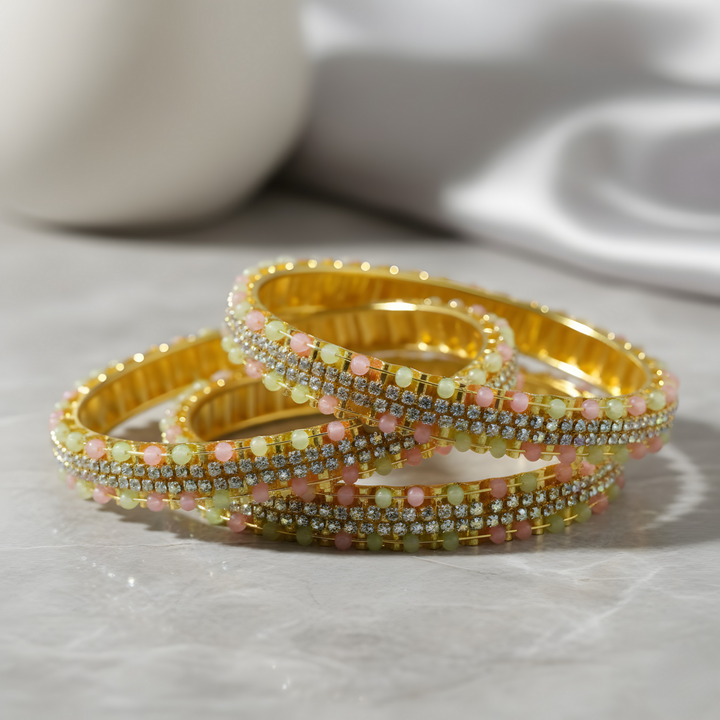 Elevate your ensemble with these Elegant Pastel Beaded Gold-Plated Bangles. Expertly crafted, each bangle features delicate pastel beads paired with a refined gold-plated finish, offering a sophisticated touch to any outfit. Lightweight yet durable, they ensure comfortable wear throughout the day, perfect for both casual and formal occasions. These bangles add timeless charm and subtle elegance to your jewelry collection.