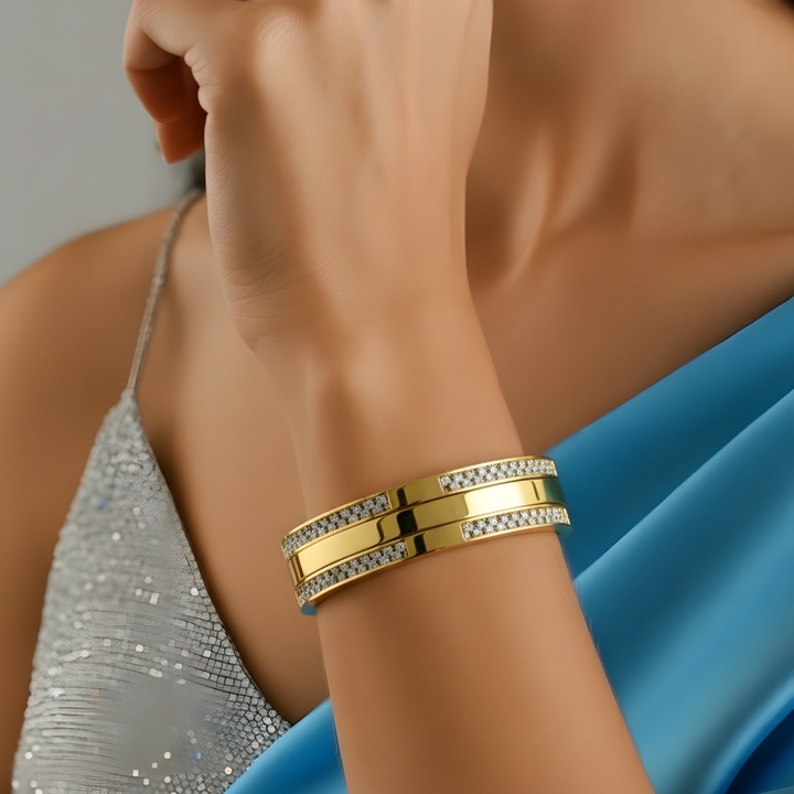 One of the benefits of the Luxury Gold-Plated Bangle with American Diamond is its versatility. Whether you’re dressing up for a wedding or adding flair to your everyday outfit, this bangle adjusts beautifully to any ensemble. Here are a few styling options: