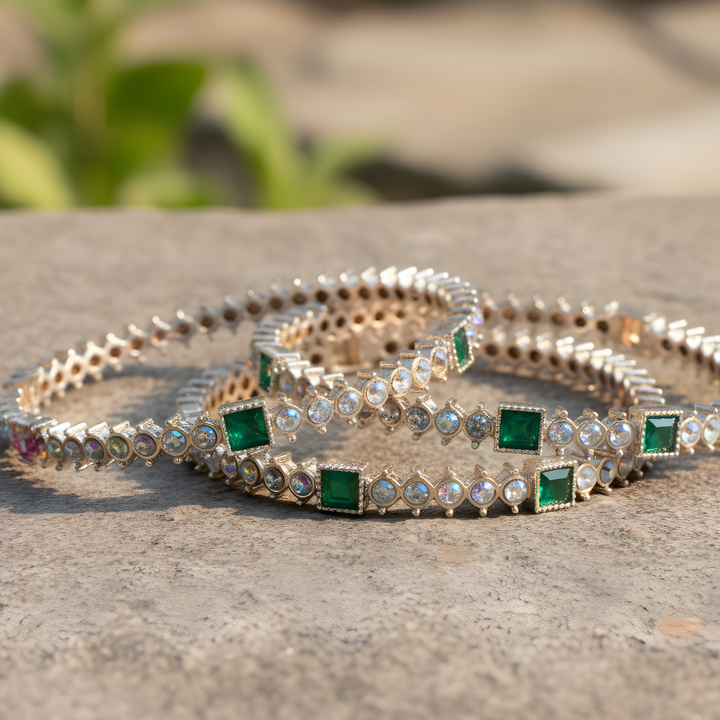 Add a touch of brilliance to your style with this stunning AD-studded bangle from Victorian Jaipur. Crafted with precision, it features high-quality American Diamonds set Embrel Green Stone Work in a gleaming gold-plated base, offering a perfect blend of elegance and sparkle. The intricate design reflects timeless craftsmanship, making it an ideal choice for festive occasions, weddings, or evening wear.