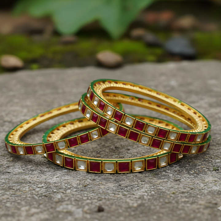 Step into timeless elegance with this handcrafted gold-plated bangle from Victorian Jaipur. Embellished with radiant ruby-red and emerald-green stones work, its intricate square design add a royal charm inspired by Rajasthan’s royal heritage. Perfect for weddings, festive wear, or evening celebrations, this statement piece exudes luxury and grace in every glance.
