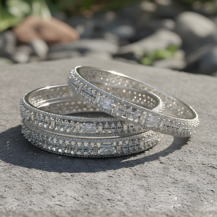 Introducing our stunning silver-plated diamond-cut bangles with sparkling stone accents, the perfect accessory to elevate any outfit. Crafted with precision, these bangles combine elegance and modern design, making them a must-have addition to your jewelry collection. Whether you're dressing up for a special occasion or adding a touch of glamour to your everyday wear, these beautiful bangles are sure to turn heads.