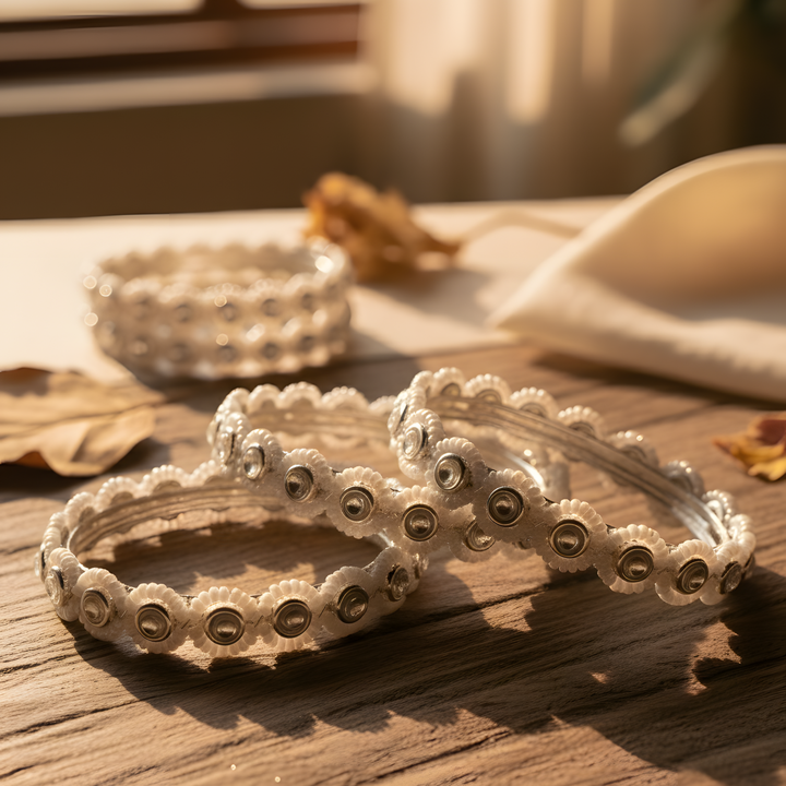 Infuse your wrist with the delicate poetry of blooming petals with our Handcrafted Floral Bangles with White Stone and Beaded Accents for Elegant Style Silver Plated. Evoking the serene gardens of Jaipur under a full moon, these silver-plated treasures blend artisanal finesse with ethereal grace, where floral motifs unfurl in soft white stones and shimmering beads. Tailored for the woman who cherishes subtle artistry, they lend a luminous, romantic whisper to bridal veils or bohemian brunches, turning every gesture into a graceful sonnet of style.