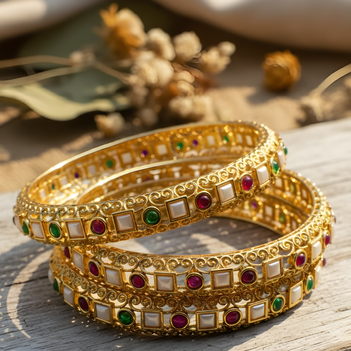 Step into timeless elegance with this handcrafted gold-plated bangle from Victorian Jaipur. Embellished with radiant pink and emerald-green stones, its intricate square pearl design add a royal charm inspired by Rajasthan’s regal heritage. Perfect for weddings, festive wear, or evening celebrations, this statement piece exudes luxury and grace in every glance.